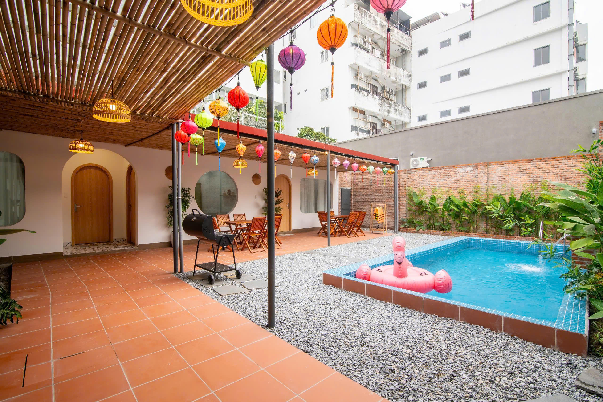 - 주소: Mỹ khê 8, Sơn Trà, Đà Nẵng - 면적: 300m2 - 빌라 구조: (계단 없는 단층 구조) + 넓은 거실 + 침실 4개 (침대 5개), 욕실 4개 - 빌라 편의시설: + 프라이빗 수영장 + 실내 당구 공간 + 별도의 세탁실 + 고급 BBQ 그릴 - 수용 인원: 기본: 성인 8명 + 6세 미만 어린이 3명 또는 성인 최대 10명 - 주변 편의 시설: + 미케 해변까지 도보 5분 + 다양한 카페와 인접 - 청소 정책: + 수건 무료 교체 (2박마다 1회) - 요금: + 평일: 7,300,000동/박 + 주말: 7,800,000동/박 + 공휴일: 500,000동/박 추가 요금 |